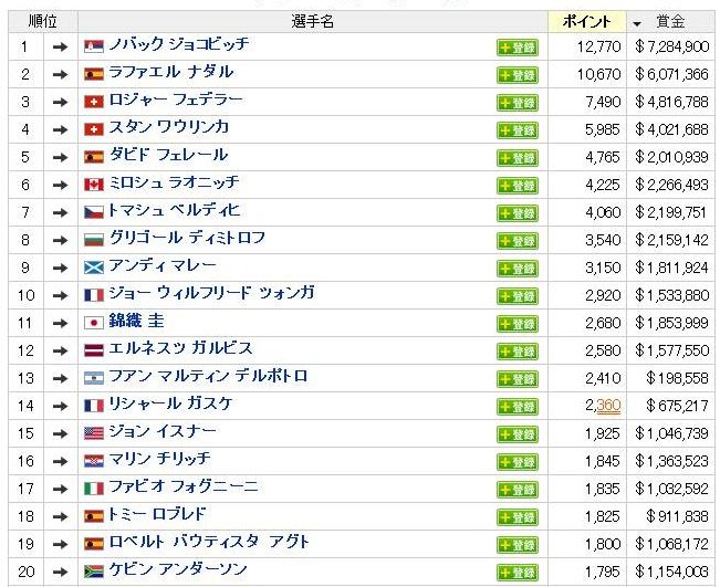 錦織圭は11位