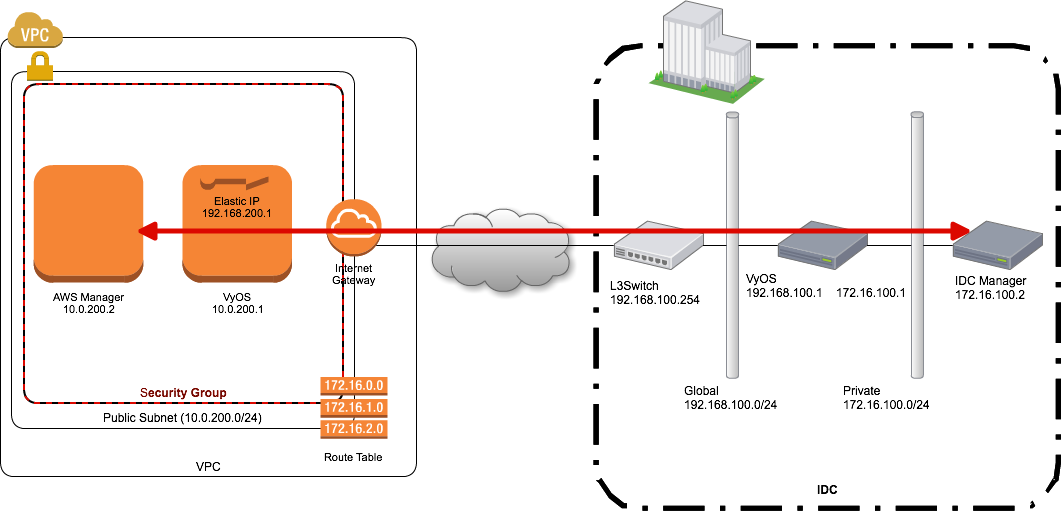 - VyOS はともかく、その先の本来接続したいサーバ (今回であれば AWS Manager) にとっては IDC 宛はプライベート IP アドレス同士での接続となるため、ルーティングテーブルをなんらかの方法で設定する必要があります。これは subnet に付与する rtb で対応します。