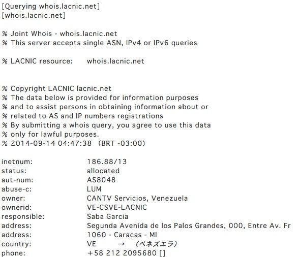 LINE乗っ取り LINEウェブストアにアクセスしようとしたベネズエラのIP「186.91.203.125」whois検索結果