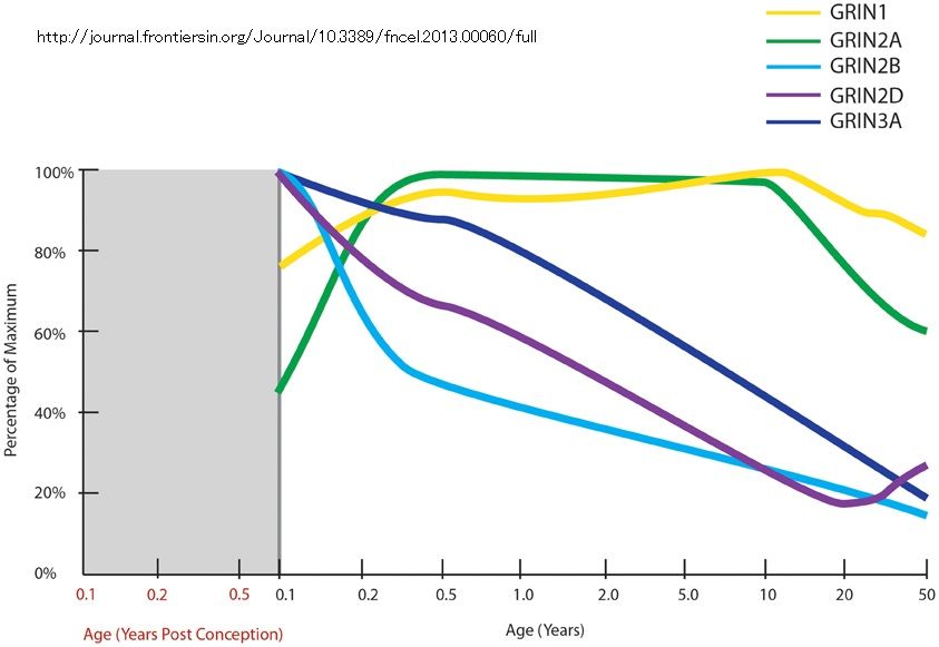 NMDA受容体は、脳の発達の間におけるシナプスの可塑性、すなわち、学習や記憶などの高次の認知機能の適切な発達の基礎という重要な役割を担う。