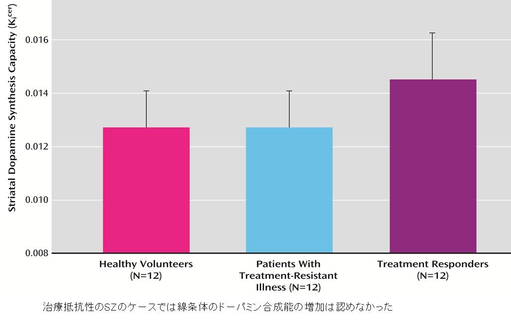 Demjaha らは、さまざまな抗精神病薬に反応しない難治性の精神病患者では、ドーパミン合成能の増加という典型的な所見を欠いていることを確認した(このようなケースにはドーパミン受容体をブロックするようなタイプの抗精神病薬は効果が乏しい)。