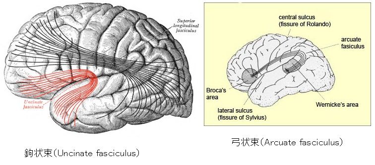 (注: 余談になるが、弓状束は言語に関するブローカ中枢とウェルニッケ中枢という2つの重要な領域をつなぐ白質束である。この接続が障害されると伝導性失語などを生じ言語によるコミュニケーションに支障をきたすことになる。自閉症を患いながらも絵本などの創作活動を行っている東田直樹さんの姿がNHKで放送されていたが、彼はfMRI検査で弓状束の障害があることが見つかっている。アルファベットを書いたボードでローマ字を駆使しながら会話する彼の姿をTVで見たが、自閉症を超越した姿に思え感動的であった。統合失調症のコミュニケーションの障害や幻聴なども弓状束が関係しているのかもしれない。)