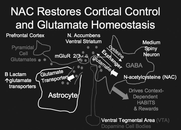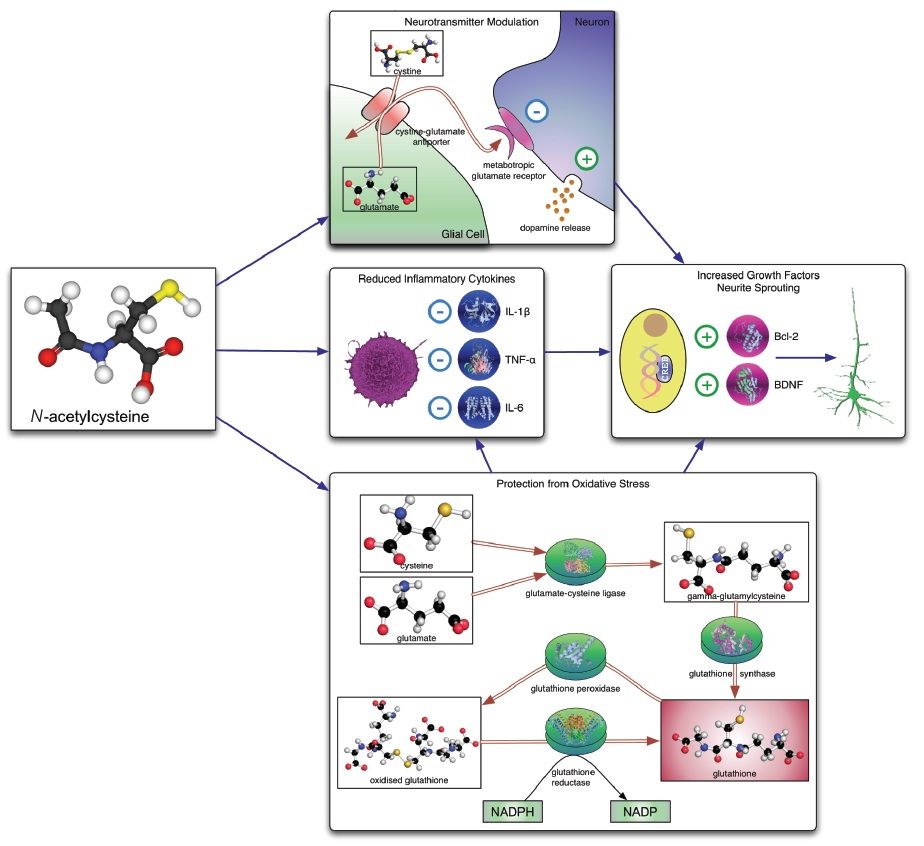 NACは特に興味深い物質であり、NACはグルタミン酸作動性神経伝達(注; アストロサイトのグルタミン酸トランスポーターを回復させる、炎症などによって増加したシナプス外のグルタミン酸の濃度を正常化させ、グルタミン酸の恒常性を維持する)、抗酸化グルタチオン、ニューロトロフィン、アポトーシス、ミトコンドリア機能といった多様で多くの因子をターゲットにするだけでなく、炎症経路をもターゲットとして作用できる。