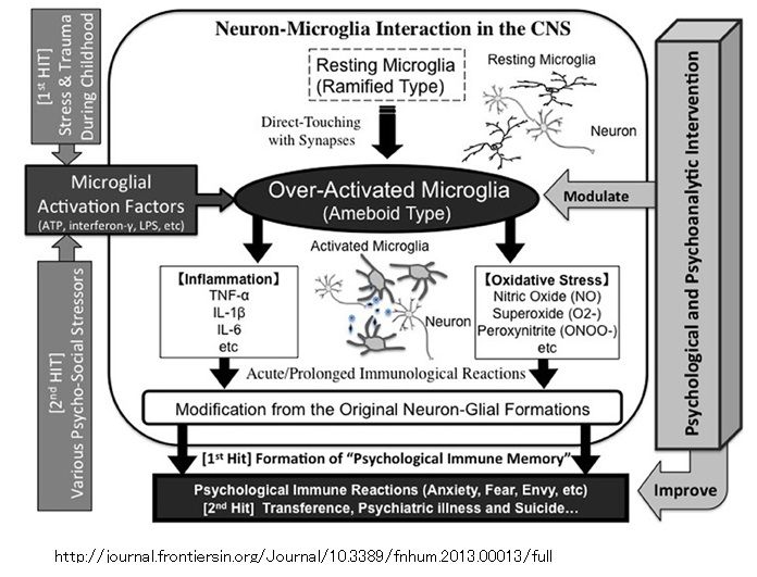 そして、急性炎症は慢性炎症状態に移行し、脳の発達に悪影響を及ぼす。統合失調症ではミクログリア細胞の活性増加が推測され支持されているが、11C-PK11195 PETを使用した2つの研究では、特に、初期の段階の統合失調症における側頭葉のミクログリア細胞の活性が増加していることが報告されている。