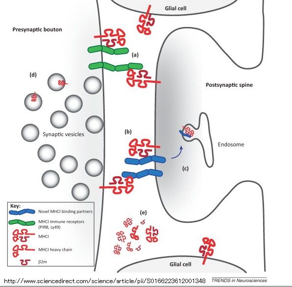 さらに、MHCクラスI分子は、神経突起伸長、シナプス形成、シナプスの機能、可塑性や活性の恒常性の維持、活性に依存性したシナプスの精錬といった脳の発達の多くの場面で直接的な作用を及ぼし脳の発達の調節をしている。