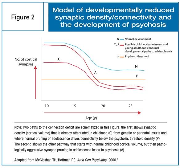 精神病症状が出た時には、長年にわたるNMDA受容体やGABA作動性機能の低下によって既に脳の成熟やシナプス可塑性は不可逆的な障害を引き起こしている可能性がある。従って、統合失調症の治療は、脳の接続性が柔軟でなくなる前の発達ウィンドウという重要な時期においてのみ真に効果的なのかもしれない。