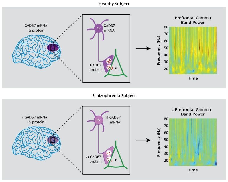 死後脳の研究では、GABA作動性介在ニューロン、すなわち、パルブアルブミン含有シャンデリア細胞の集団が統合失調症の患者では減少することが一貫して示されている。そして、GABA作動性神経伝達に関わる酵素、例えば、グルタミン酸脱炭酸酵素(GAD)67やGABAトランスポーター(GAT)1は統合失調症患者では減少することも一貫して報告されている(下のレビューを参照)。