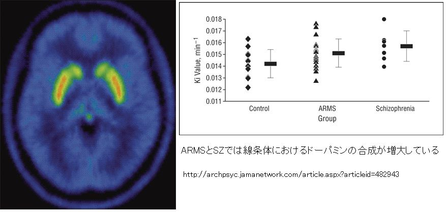 線条体のドーパミン合成の増加は精神病症状を発現する最終的な共通経路かもしれないが、認知機能の症状との関連性はあまり明確ではない。
