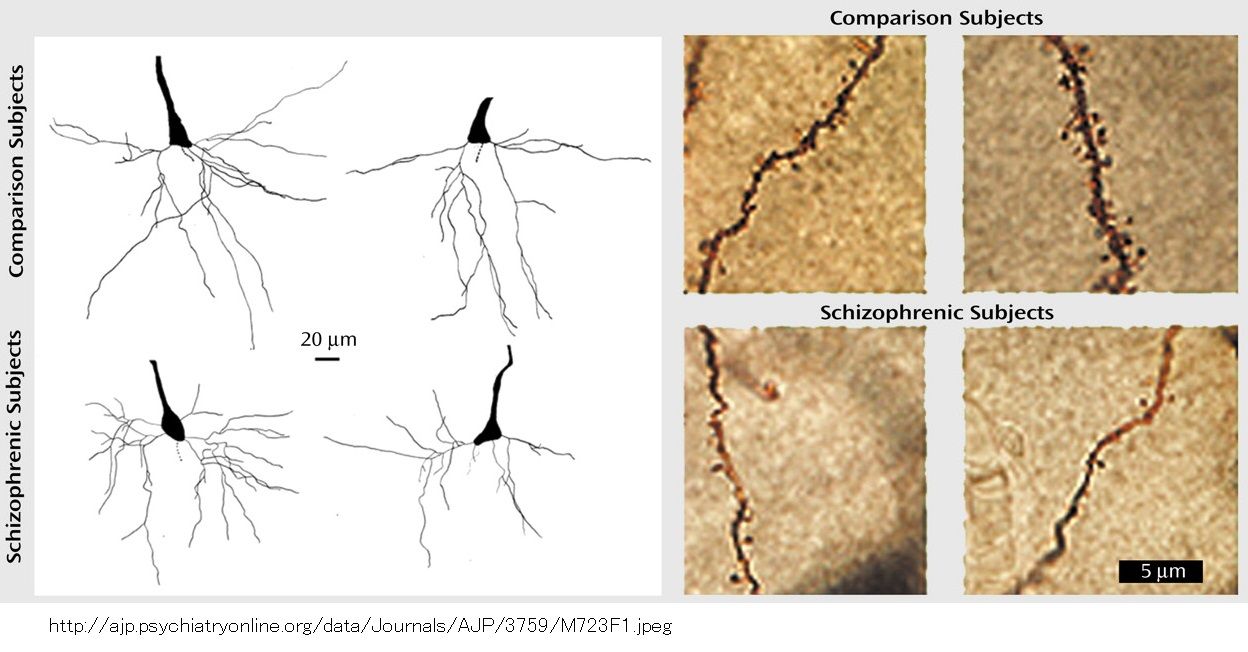 (注; 例えば、薄層化と関連する所見として、前頭前皮質における樹状突起dendritesや棘spinesの減少=シナプスの減少が見出されている。)