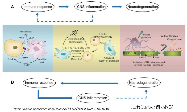 しかし、神経炎症は、自己免疫性脳炎に罹患していると特徴づけることができるケースだけでなく、統合失調症の他のグループ全体でも大きな役割を有しているようだ。未成熟な脳では、ウイルス感染や細菌感染、さらに、無菌であっても脳の損傷の結果などの原因によって炎症に曝露され易くなっている。ミクログリアは未成熟な脳における免疫を担当する細胞の中心であり、刺激に依存してはいるが、刺激分子の内容やタイミングが異なれば、様々な炎症を脳に生じさせることができる。