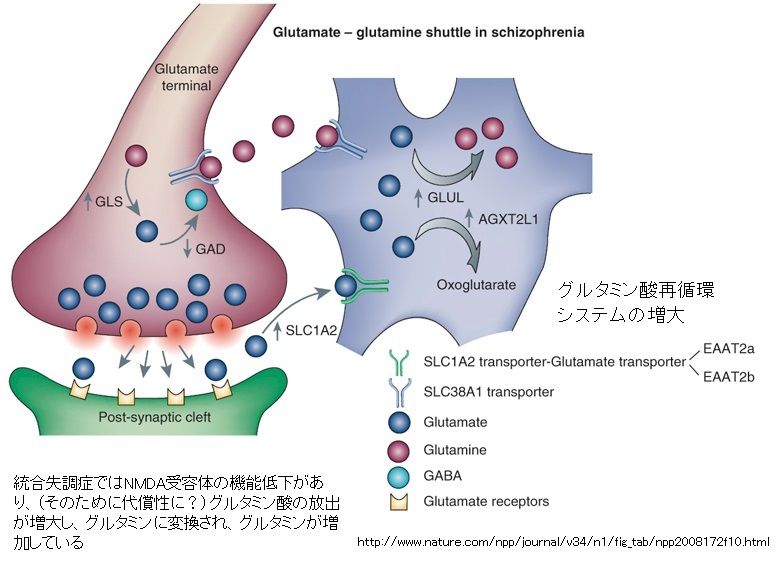 注; 補足すると、グルタミン酸はBBBを通過しない。グルタミン酸はグリア細胞からグルタミン酸の前駆体であるグルタミンから生成される。SLC1A2 (solute carrier family 1 =グリア細胞に高親和性のグルタミントランスポーターのメンバー2), AGXT2L1 (alanine-glyoxylate aminotransferase 2-like 1), GLUL (glutamate-ammonia ligase=グルタミンの合成酵素), SLC38A1 (solute carrier family 38, member 1), GLS (glutaminase=グルタミン酸の合成酵素)などがこのグルタミン⇔グルタミン酸の再循環システムに関与しており(下図)、統合失調症では殆どの場合でこれらの再循環システムが増強している。