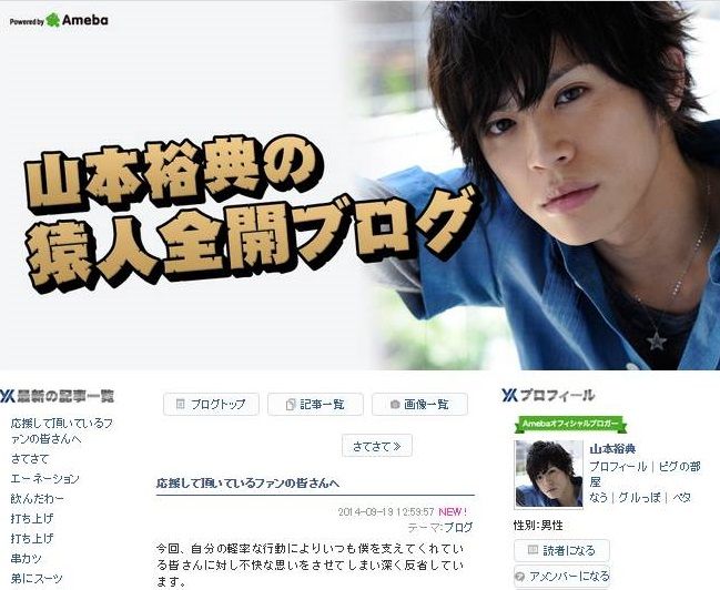 一部写真週刊誌に「お持ち帰り美女とのベッド写真」を報じられた俳優の山本裕典(26)が19日、自身のブログを更新。「今回、自分の軽率な行動により、いつも僕を支えてくれている皆さんに対し、不快な思いをさせてしまい、深く反省しています」と謝罪した。