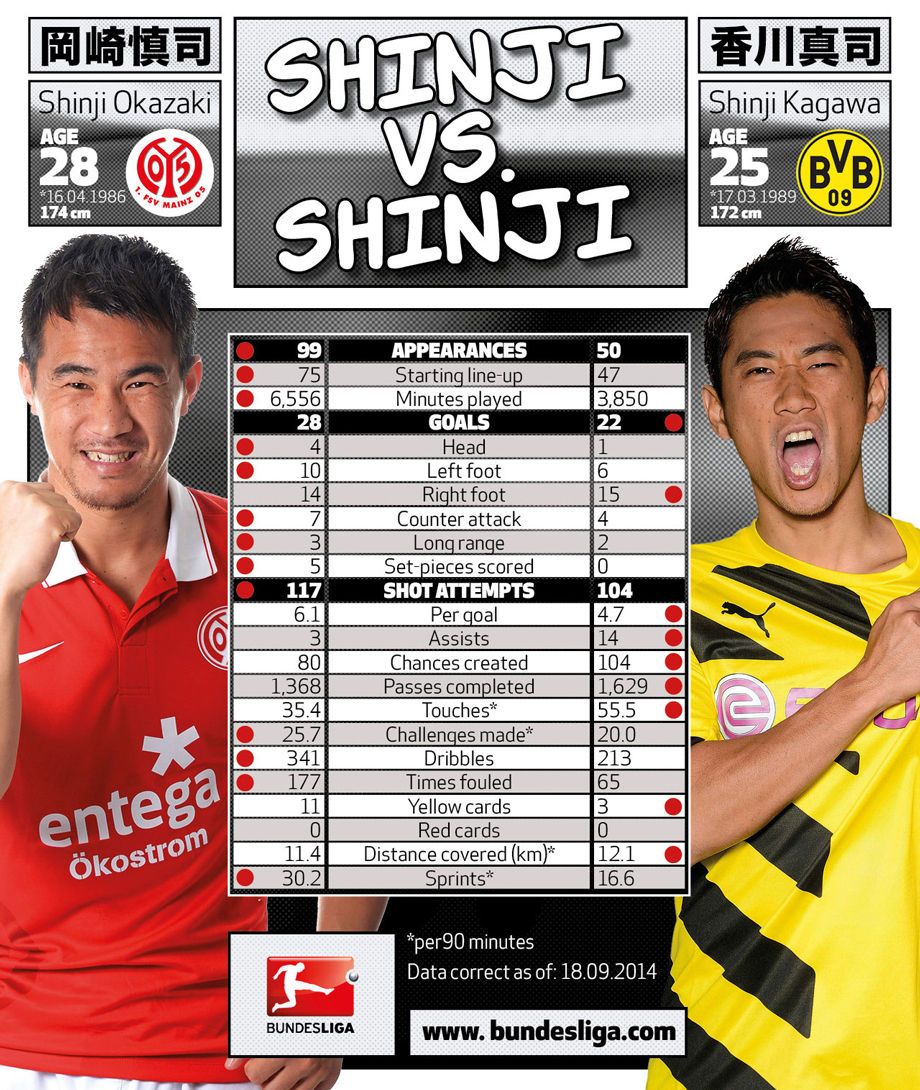 ブンデスリーガは次なるシンジショーを体験した。しかし、この試合を圧倒したのは、ドルトムントのスターである香川真司ではなく、マインツのストライカー岡崎慎司だった。BVBはマインツ戦を取りこぼし2-0で敗戦。また一方の日本人選手は肩すかしのプレーだったものの、もう一方は見事であった。