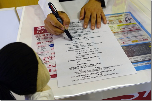 これら必要情報と書類が確認でき、「おし、そなたの当日MNPをうけたもう」(もちろんこれも筆者意訳)となれば、次に選ぶのが契約プランとSIMカードのサイズ。1カ月に使いたいデータ通信量に応じて、ミニマム(1600円/1GB)、ライト(2220円/2GB)、ファミリーシェア(3260円~/3GB)から選択します。またSIMカードのサイズは自分が持っているSIMフリー端末(もしくはドコモ端末)に対応したSIMカードを選びます。わからないことがあれば、頼りになるカウンターの方が教えてくれるのでご安心ください。