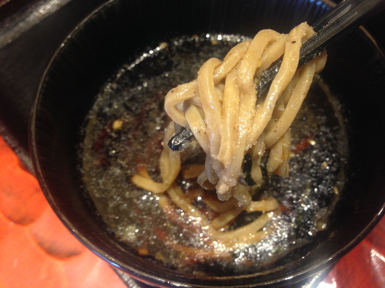 そしてパッと見でわかるタレ表面の油。おそらくラー油を使っていますね。かなり甘辛い濃い口になっていて、いやでも蕎麦が進みます。