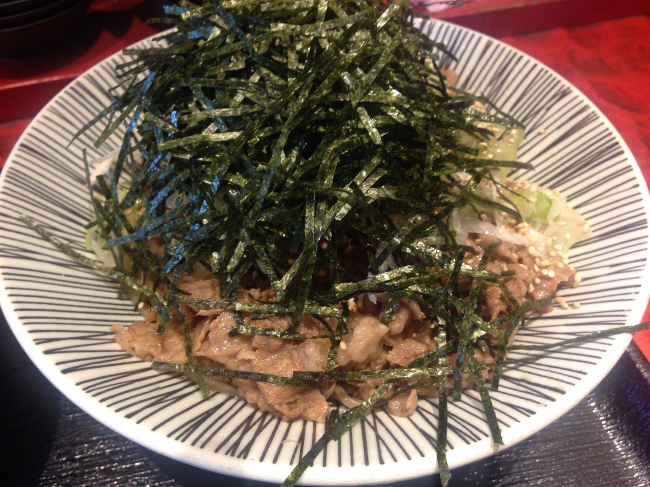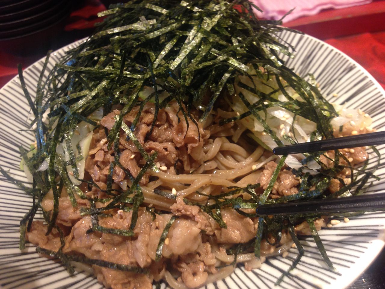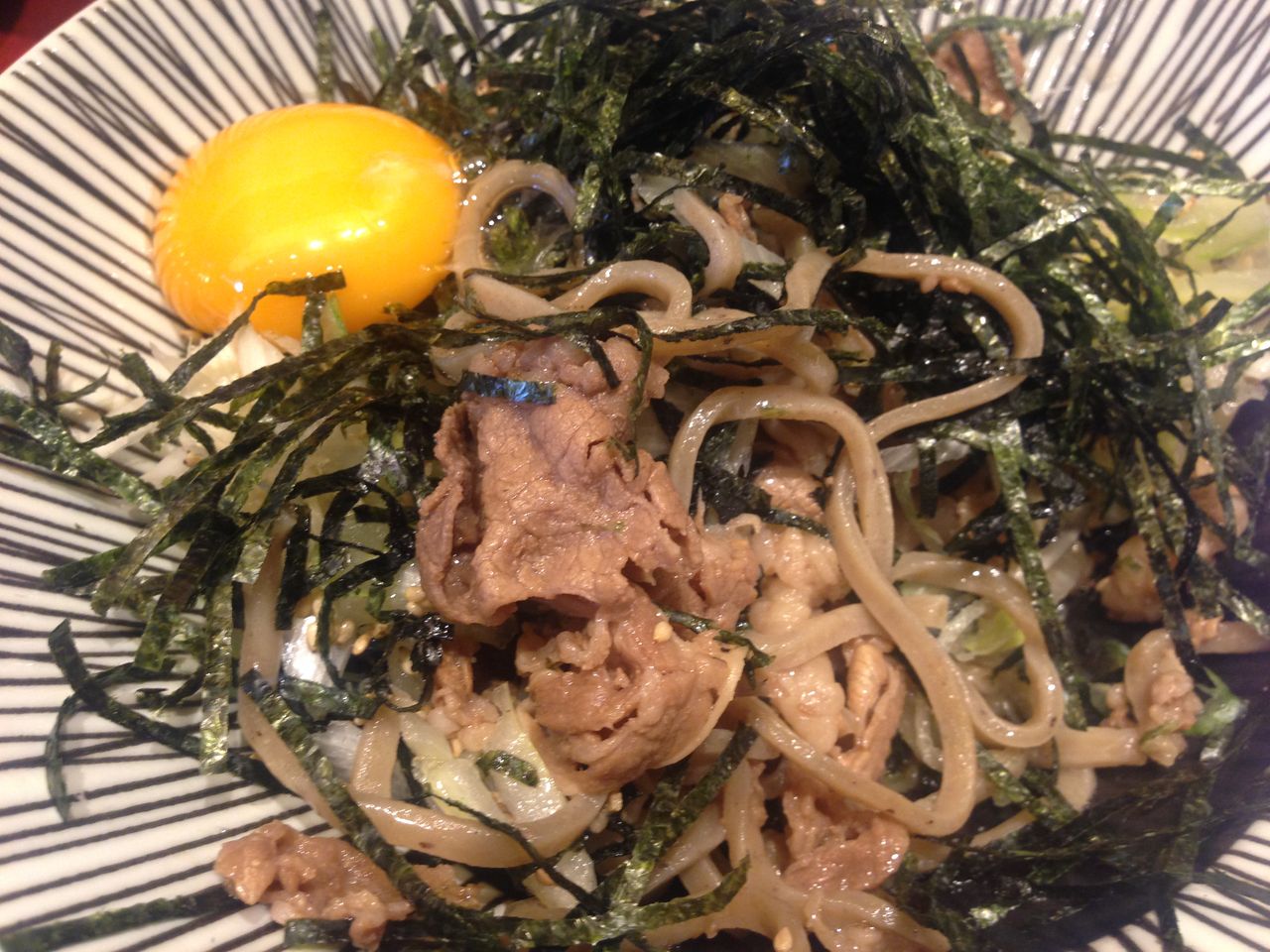 海苔をかきわけるとお肉がたっぷり。そばが顔をのぞかせます。
