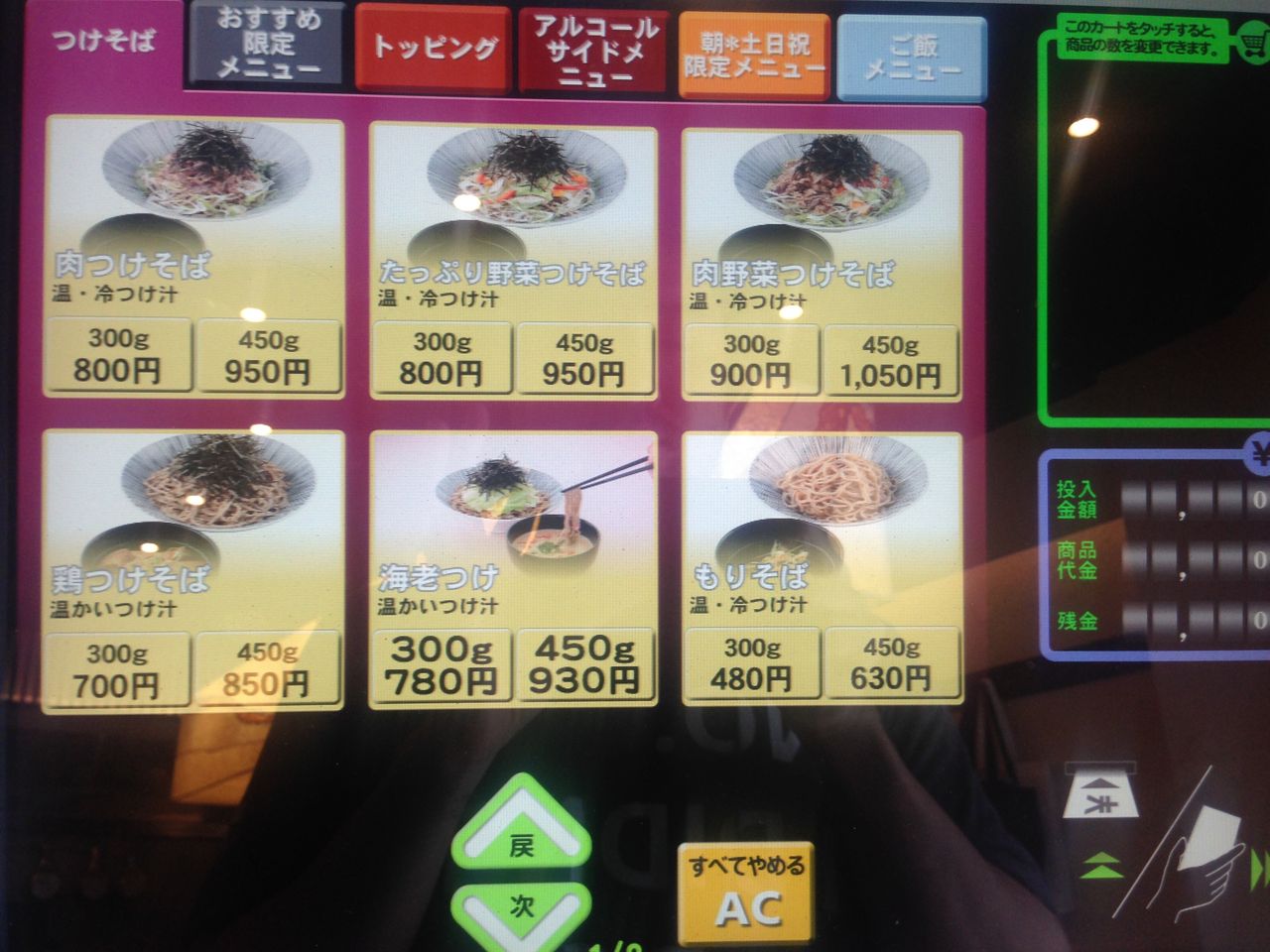 店内は食券制。富士そばよりも洗練された機種で、完全タッチパネルです。蕎麦とタレが特徴的なのでふつうの「もりそば」でもいいんですが、せっかくなので「肉つけそば」いっておきましょう。