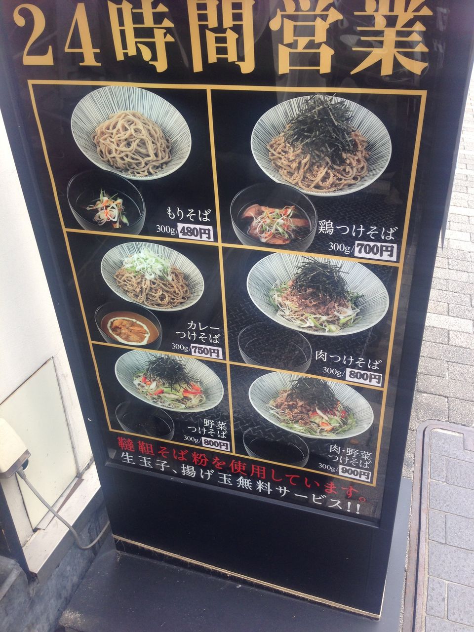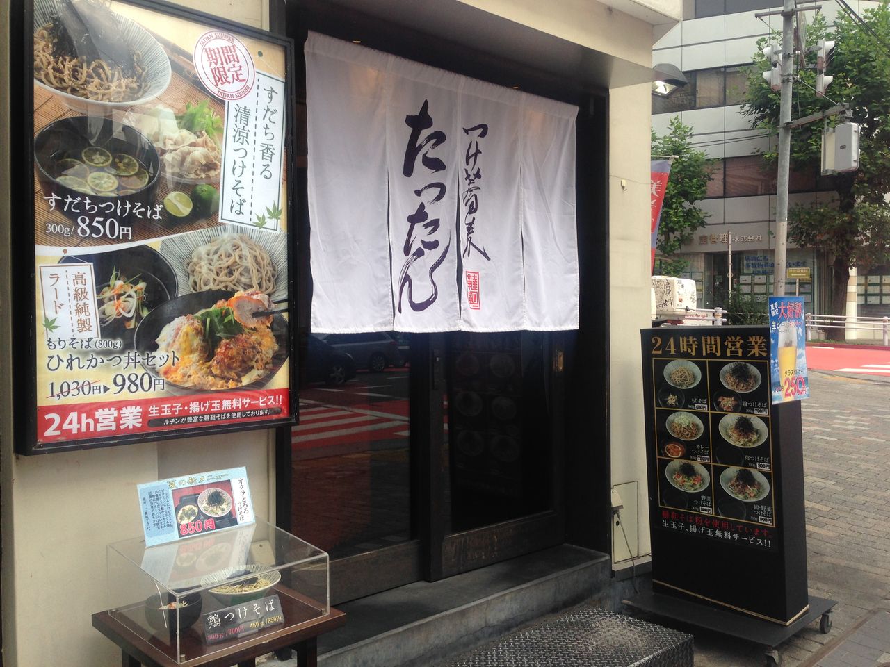 こちら店名は「つけ蕎麦 たったん」といいます。なんかいい感じの暖簾に、やたらとわかりやすいメニュー表示と「24時間営業」の猛アピール。
