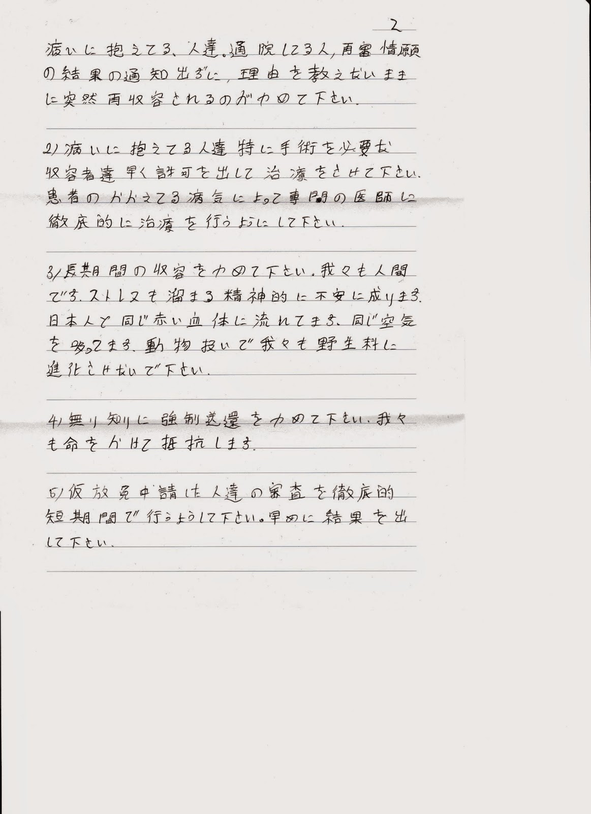 3)長期間の収容をやめて下さい。我々も人間です。ストレスも溜まる精神的に不安に成ります。日本人と同じ赤い血体に流れてます。同じ空気を吸ってます。動物扱いで我々も野生化に進化させないで下さい。