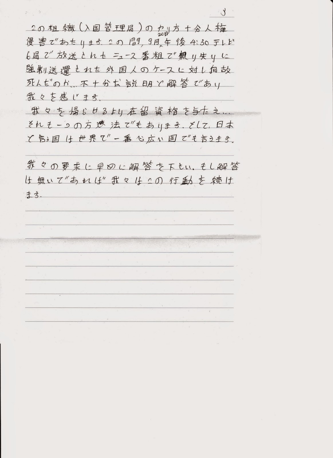 長期収容をしないことや、食事や自由時間などに関する処遇の改善をもとめています。「私達動物園に入れられてる動物ではありません」という一文が、入管の被収容者にたいするあつかいのありようをものがたっています。