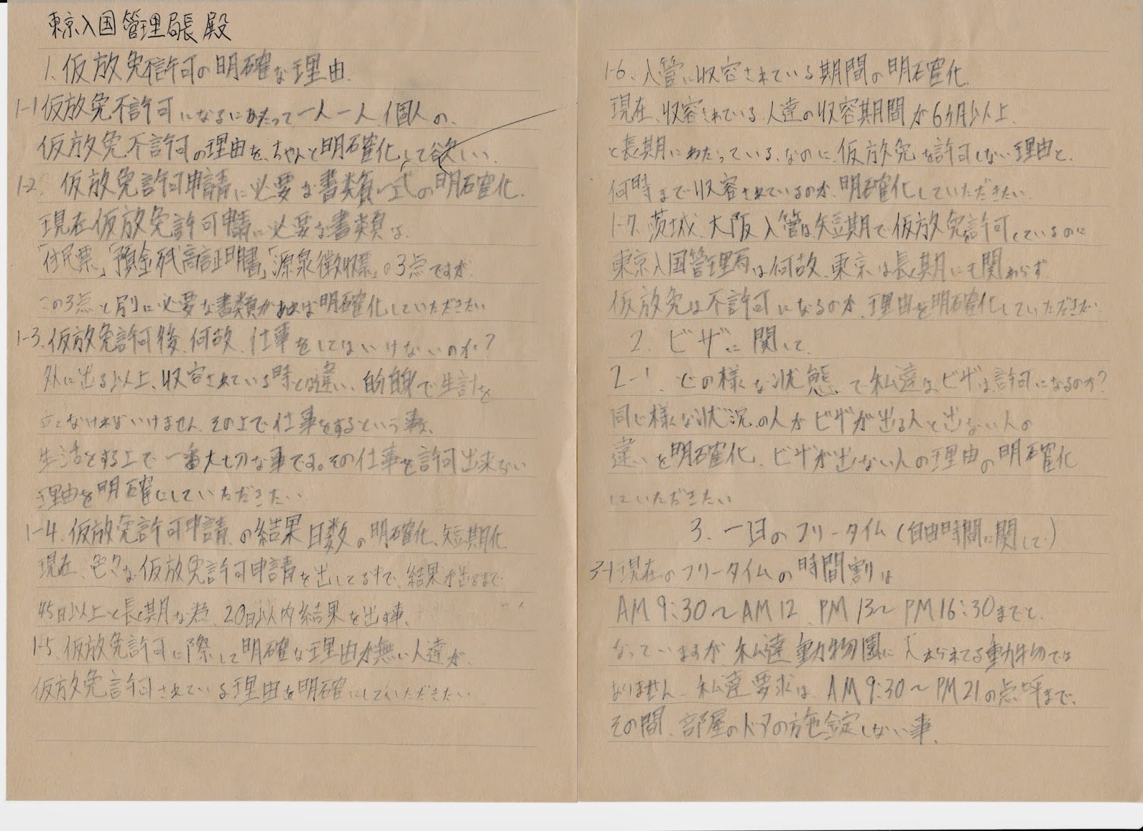 1)仮放免者達の再収容はやめて下さい。特に病いに抱えてる人達。通院してる人、再審情願の結果通知出ずに、理由を教えないままに突然再収容されるのがやめて下さい。