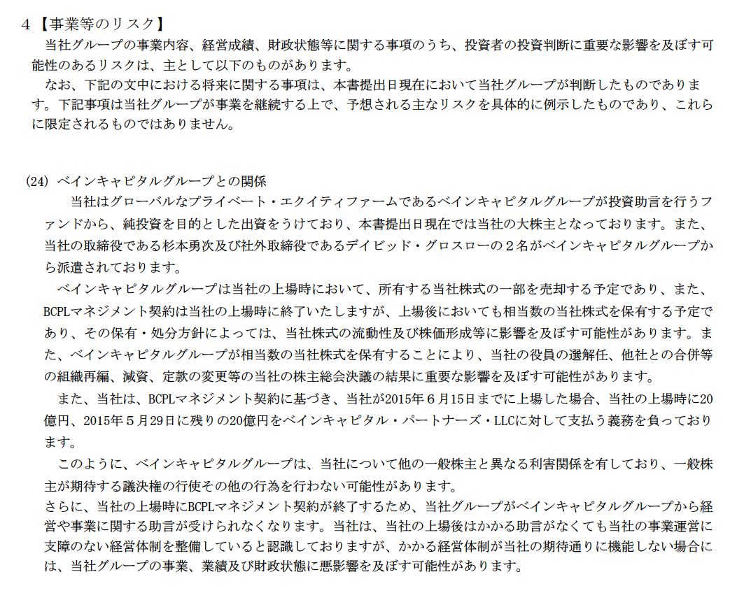 2015年6月15日までに上場した場合、当社の上場時に20億円、2015年5月29日に残りの20億円をベインキャピタル・パートナーズ・LCCに対して支払う義務を負っております