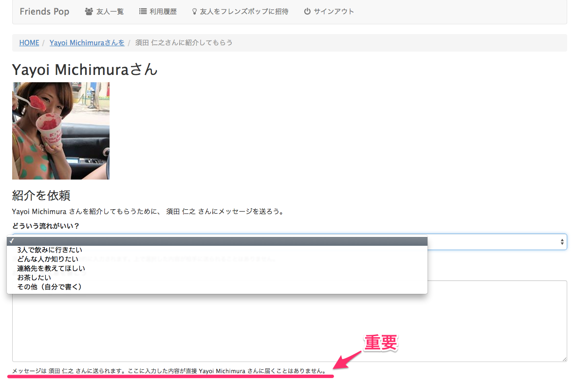 依頼の文言を選んで送信。2人っきりは緊張するので「3人で飲みに行きたい」を選びました。ほかにもいろいろ自分でメッセージを追加できます。これは紹介をお願いする須田さんに送られて、Yayoiさんには見られないのでご安心を。