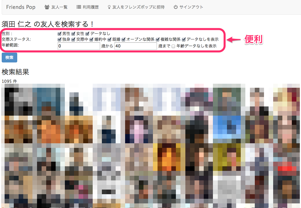 そしたら須田さんの友達がずらーっと並びます。1095人ってだいぶ多い。これを見るだけならFacebookの友人のところで十分なので、大事なのは検索機能。