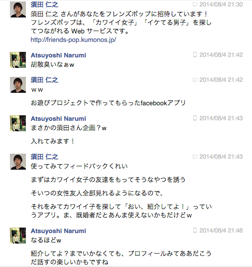 かれこれ10年以上お世話になっている前々職の大先輩、“須田さん”からある日、こんなアプリの招待がきました。最初は「なんですかこれすっげー胡散臭いw」って思ったんですが、須田さんが関わってるアプリ開発チーム「kumonos」がプロデュースしたとなれば面白そうなので使ってみることに。
