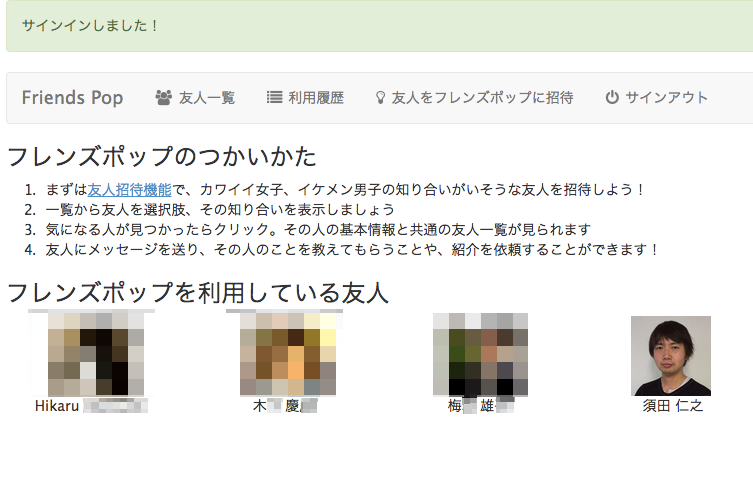 ログインすると、すでにFriends Popを使っている友人が表示されます。今回は招待してくれた須田さんのアイコンをクリック。