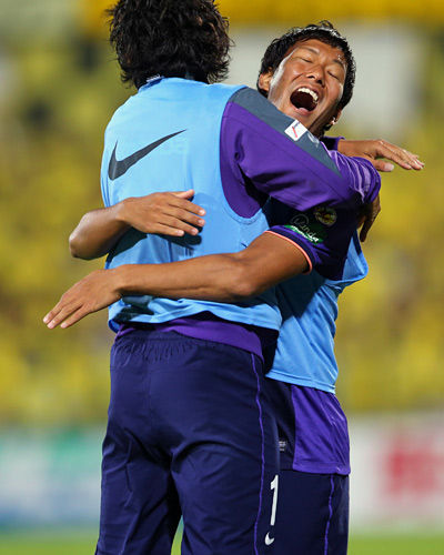 試合終了のホイッスルが鳴ると決勝進出を決めた広島の佐藤寿人と野津田岳人は抱き合って勝ち上がりを喜んだ。