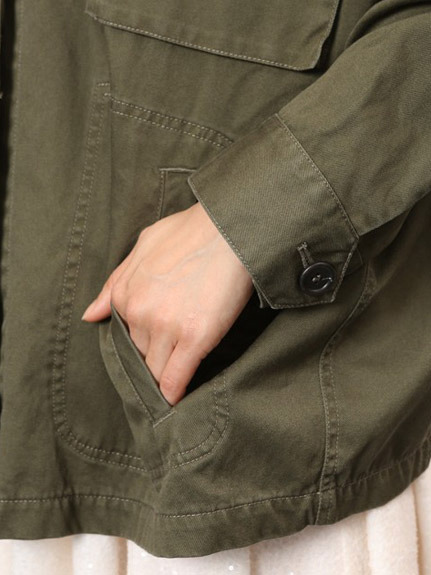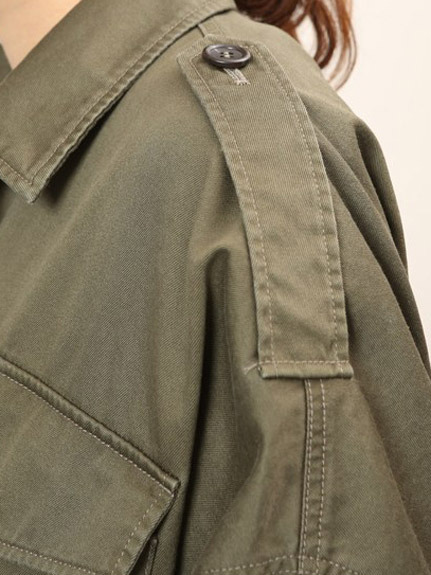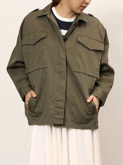 カジュアルなミリタリーアウターは ドルマンシルエットで女性らしさをプラス。