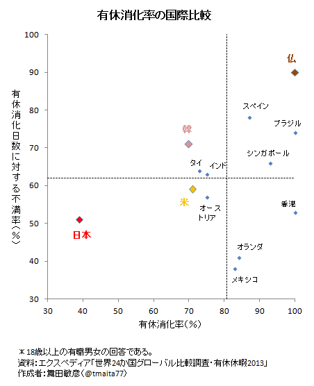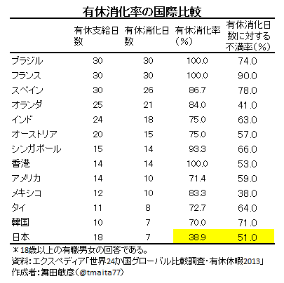 ブラジル,フランス,香港では有休消化率が100%です。労働者が,与えられた有休を漏れなくバッチリ消化する社会なり。他の国も,8割,7割を超えています。消化率が半分にも満たない社会というのは,世界広しといえど日本だけのようです。