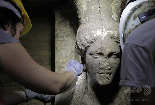 当局者によると、「2番目の入り口の壁から土を取り除いたところ、すばらしい大理石のカリアテッドが姿を現した」という。