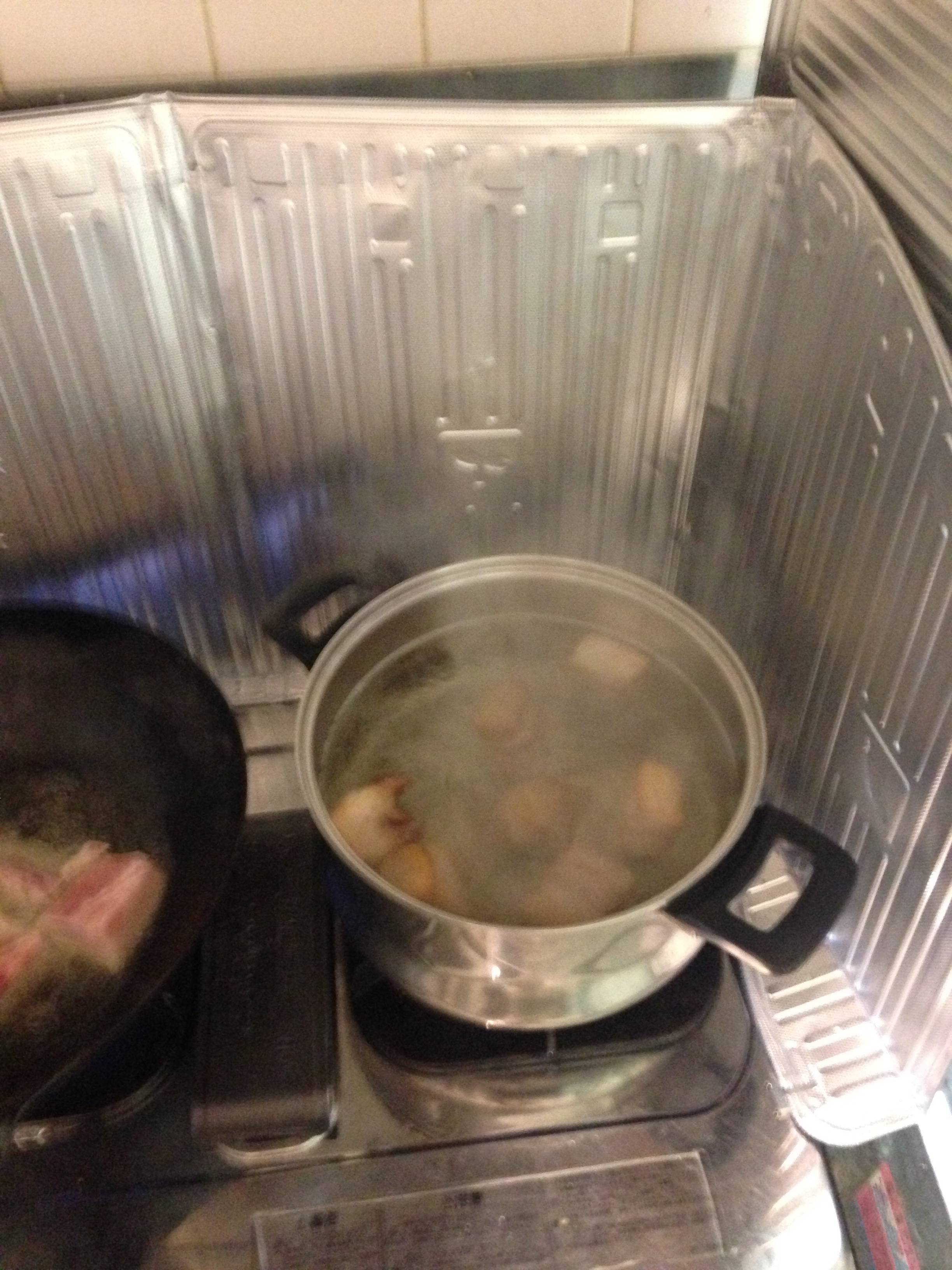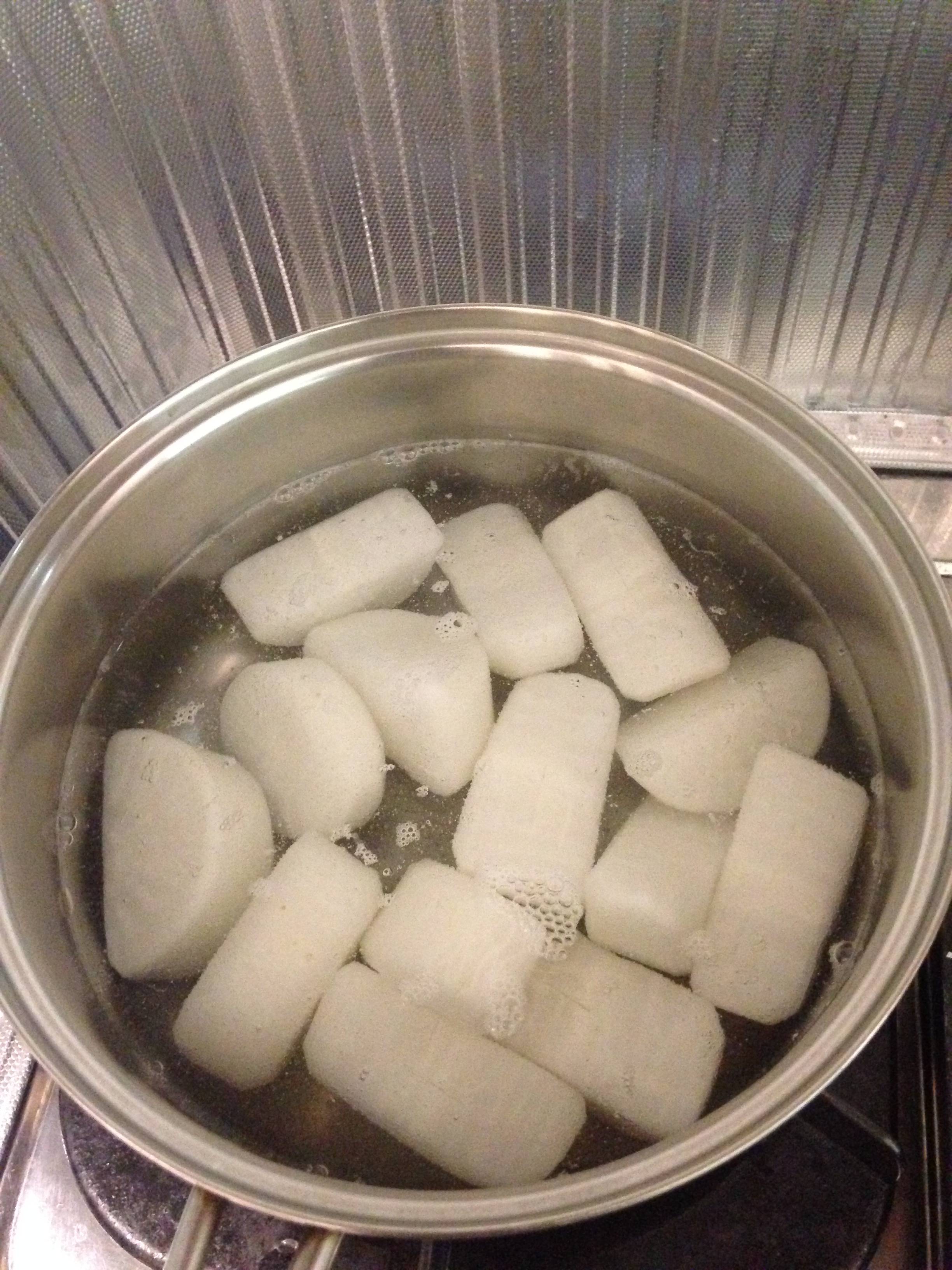 表面6面が割と硬めに揚がったら、先に沸かしておいたお湯に放り込む。