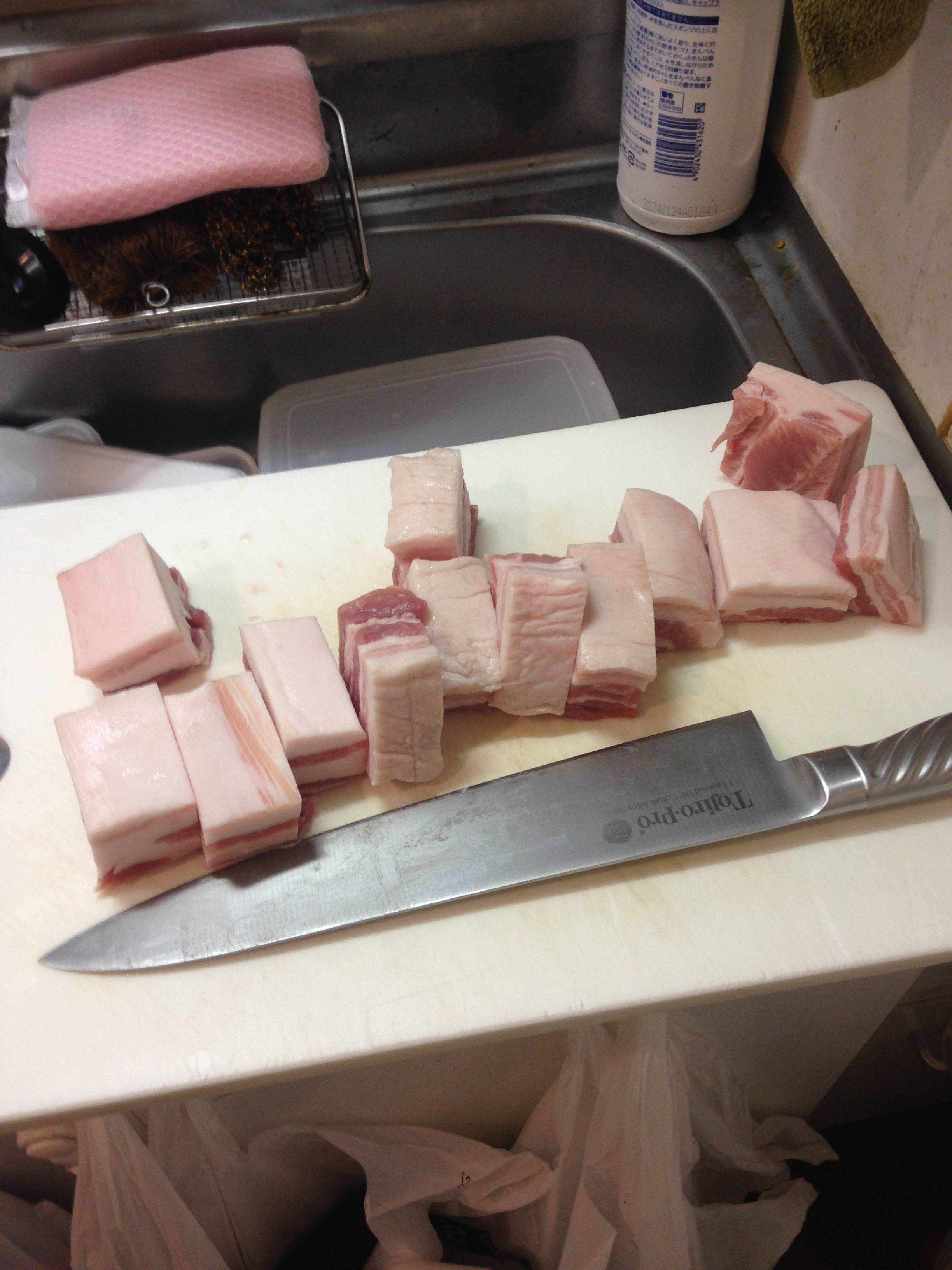 そうそう、牛筋の時にも書いたけど、豚を煮てる時に出る脂は、排水溝に捨てないで集めて萌えるゴミとして捨てような。