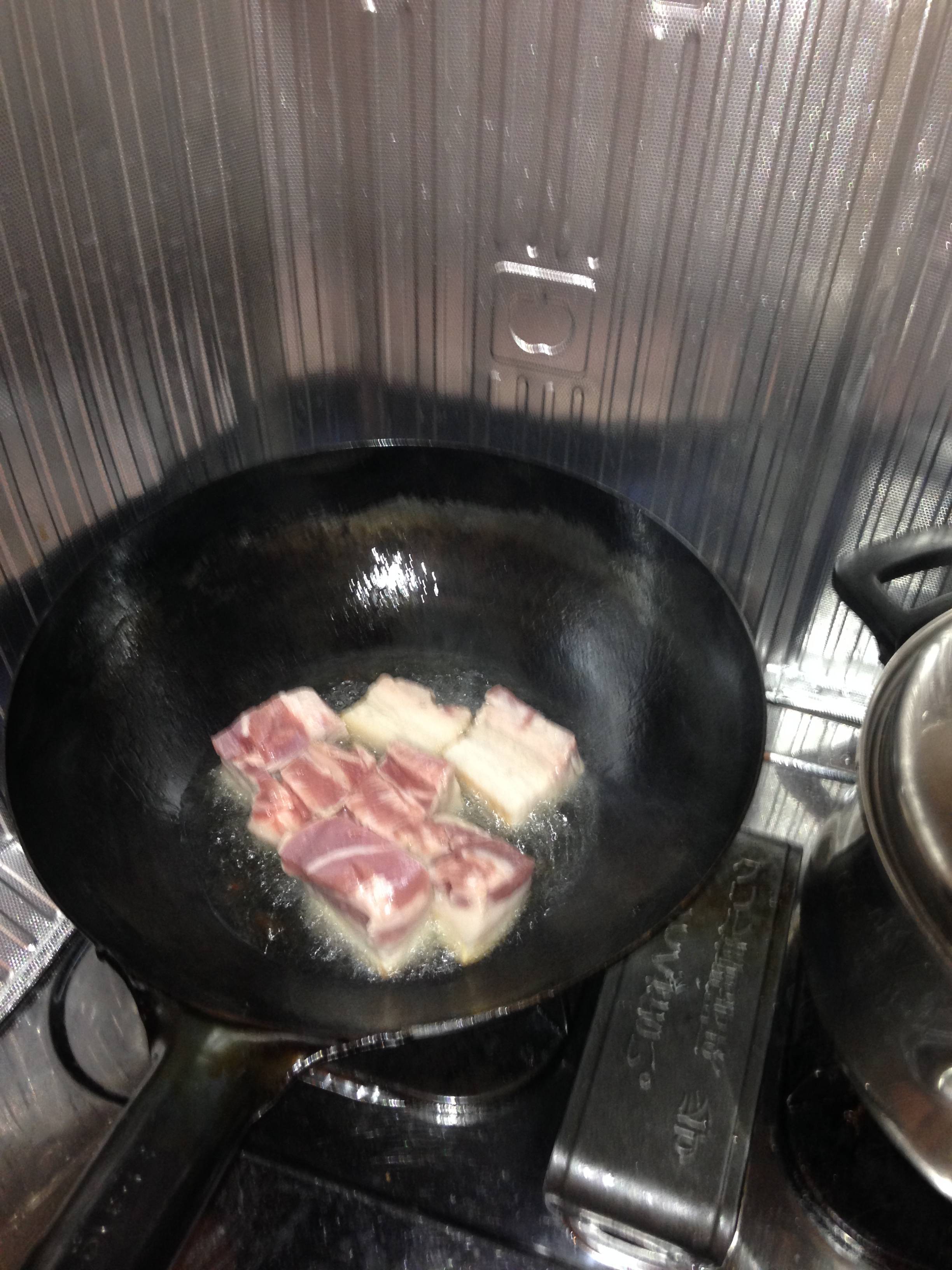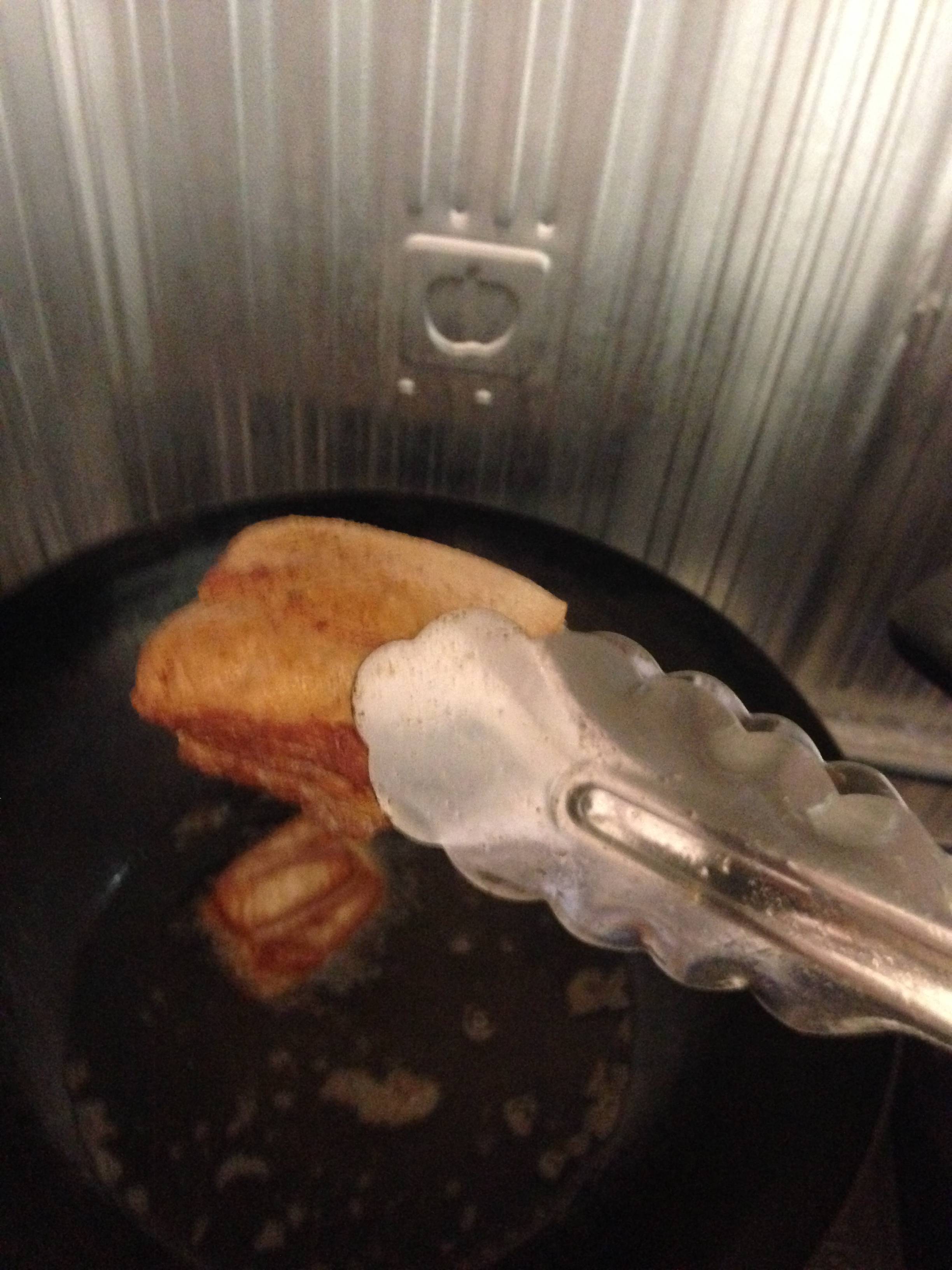 本当は掛け油でやりたいんだが、油を節約して多めの油で表面を揚げる。