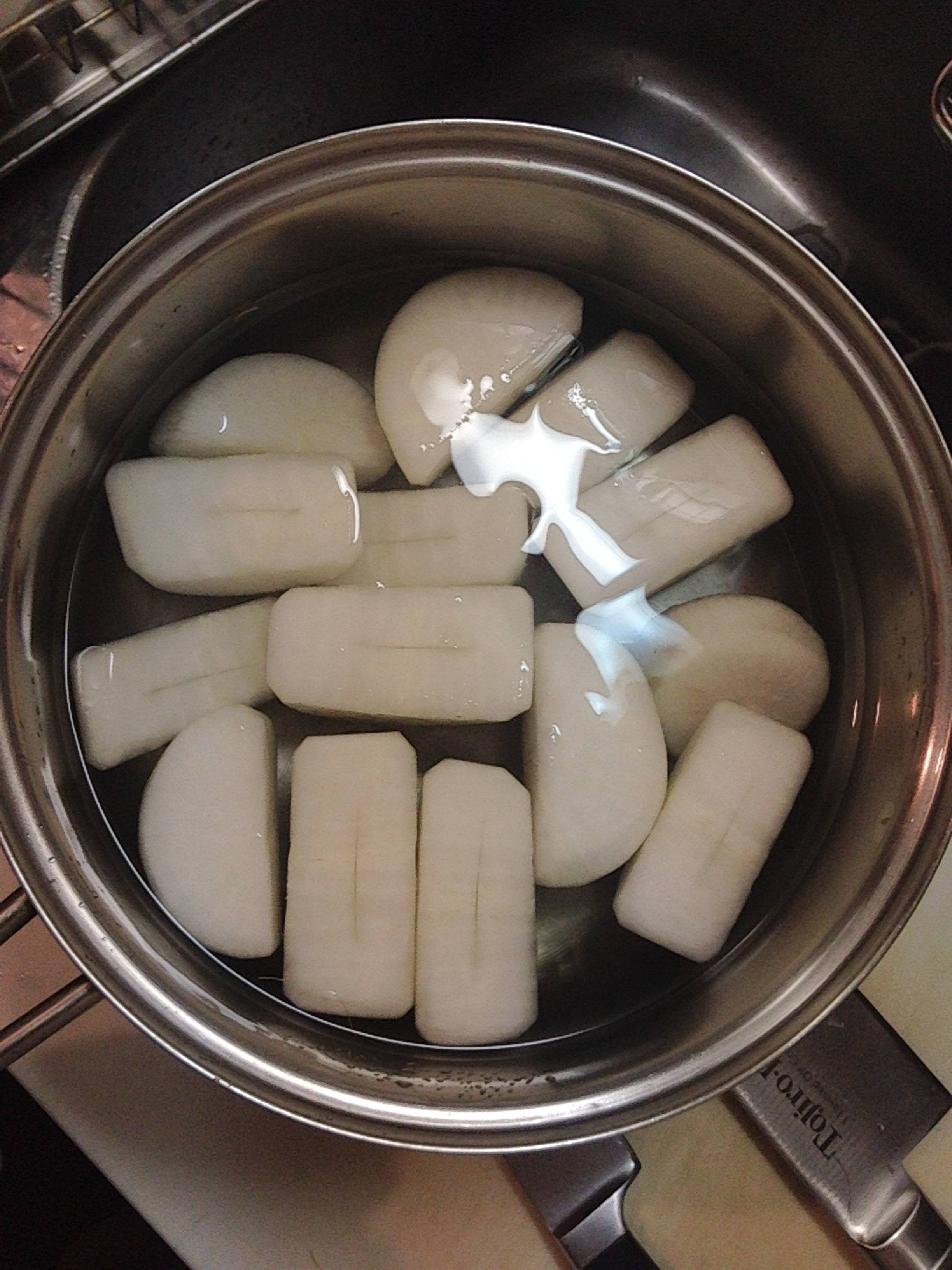 隠し包丁入れておくと早く煮える。