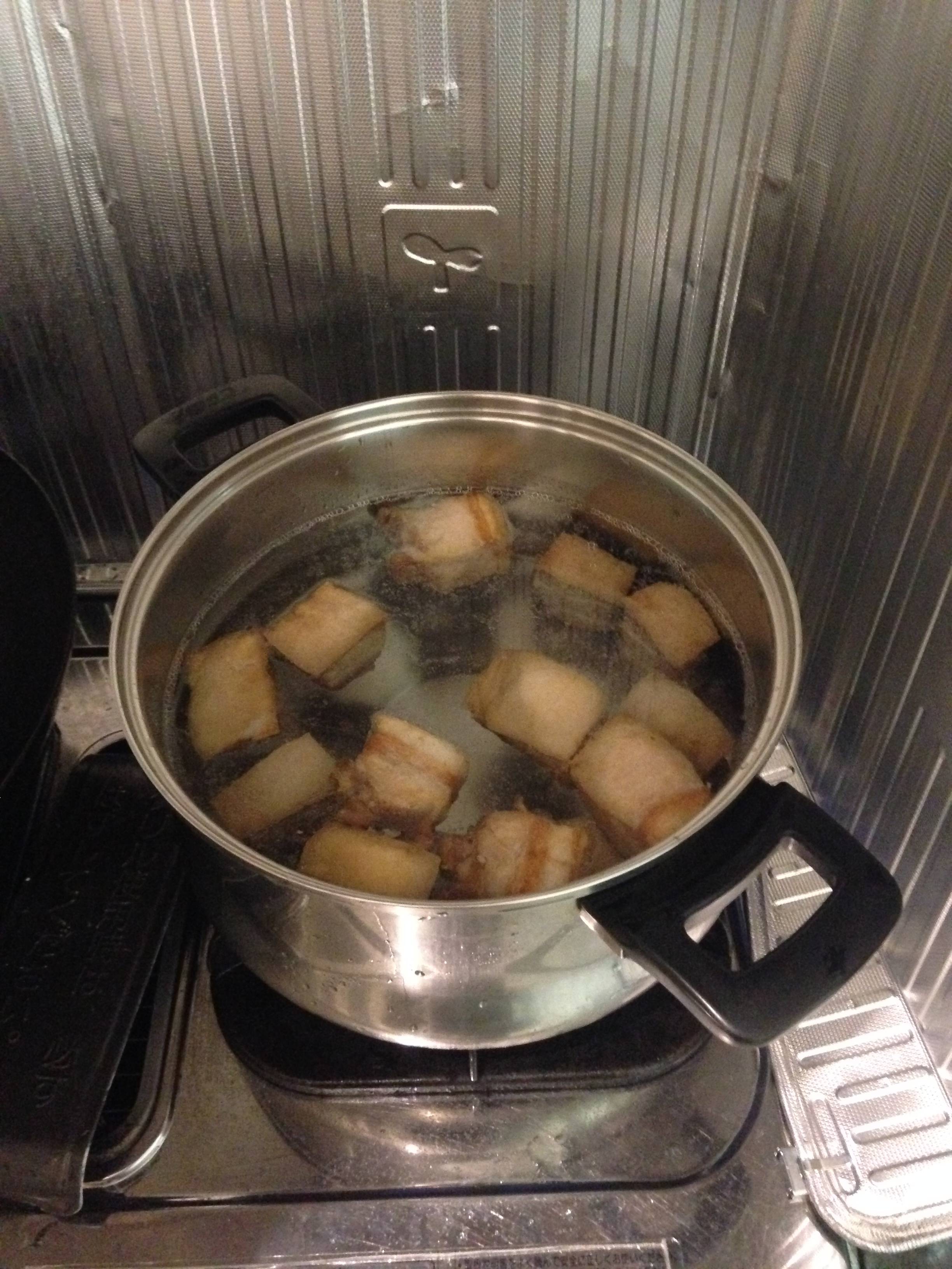 上げ固めた後に最低2回は水から煮れば、かなりの脂が取れて完成後、冷めてもべたつかない、さっぱりの角煮が出来るよ。
