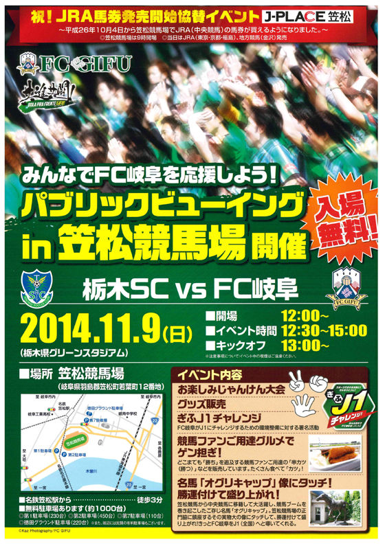 11/9(日)vs栃木SC戦、パブリックビューイングin笠松競馬場 開催のお知らせ|新着情報|FC岐阜オフィシャルサイト http://t.co/xcbiUKVvO3 いやー、これは俺得な企画だ(笑)でも、どこでPVやるんだろう?