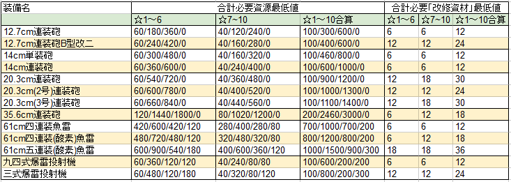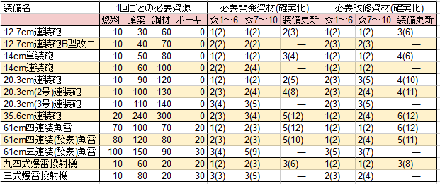 装備改修に必要な資材と資源量一覧