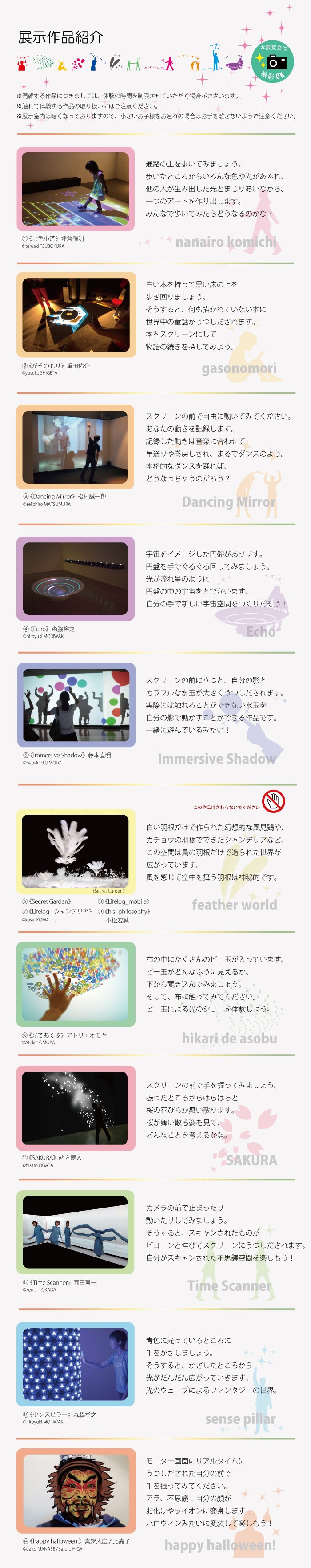 「難しい」「分かりづらい」「んっ??」と思われがちな"現代アート"が、光と「遊ぶ」ことによってより身近なものになります。私たちの身近にある素材から最新のデジタル技術を駆使した映像や光を、観覧者が見るだけでなく参加することで自身が作品の一部となり、一つのアートが完成する展覧会です。