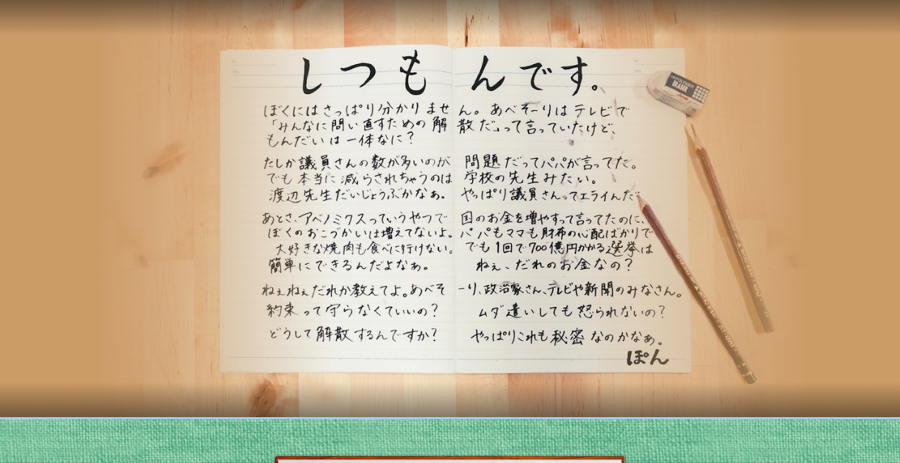 漢字もわからない小学生なら、「どうして解散するんですか」と問いかけても「もっと勉強しろ」とは言われないはず、という姑息な計算があったのではないでしょうか。