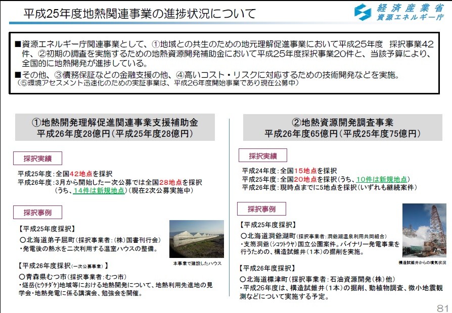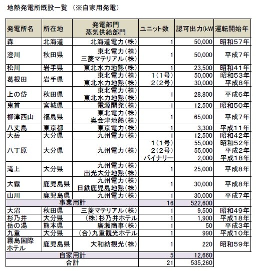 1カ所平均を事業用3.3万kWとして、理想的に順調に事が運んだと仮定すれば、今後10年間で、3.3万kW × 16カ所 = 52万kW の地熱発電が開発されることになる。これは、現在の地熱発電の設備容量とほぼ同じ規模。
