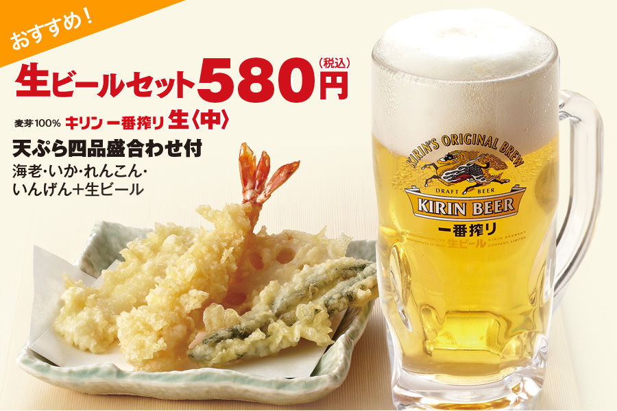 てんやに入って、まず生ビールセット(550円)注文するだろ。
