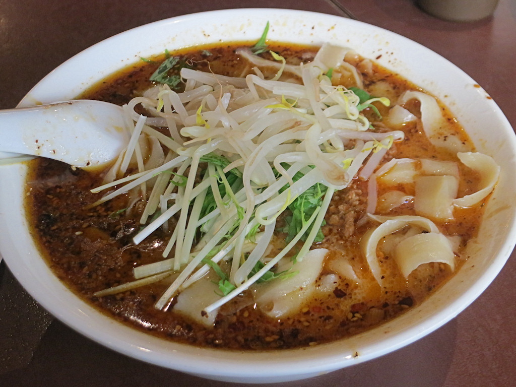教科書的なすっきりした後味のスープに挽肉、胡麻を合わせ、水菜、モヤシをトッピングしています。
