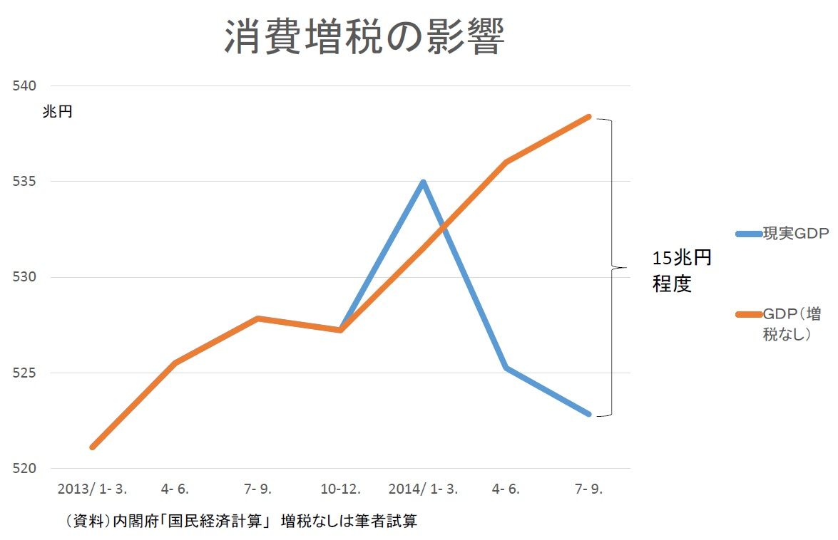 消費増税で15兆円ほどのGDPを失った。この場合、国と地方を合わせた税収も3兆円ほど失っただろう。つまり、増税して、景気が悪くなって、減収になったと最悪のパターンだ。