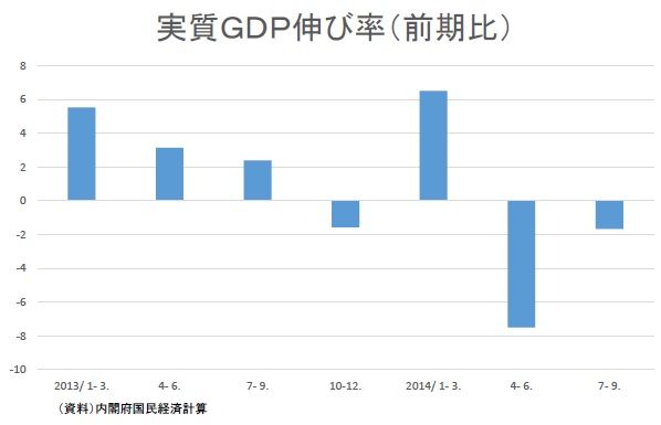 2013年7-9月期から10-12月期、駆け込み需要のあった14年1-3月期、その反動減と消費増税による需要後退のあった4-6月期、そしてこの7-9月期の実質GDPの対前期比はそれぞれ、2.4%増、1.6%減、6.7%増、7.3%減、1.6%減である(下図)。
