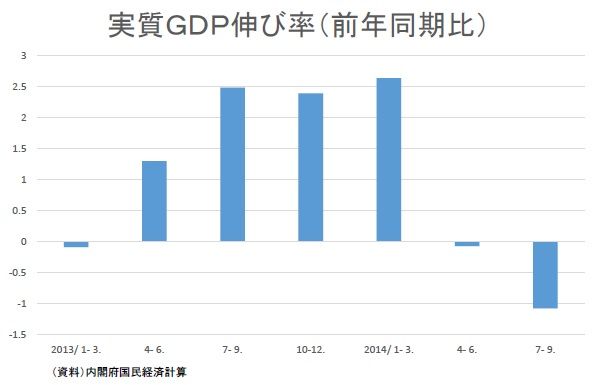 これを見ると、消費増税の4月以前には、2%程度の実質経済成長をしていたが、消費増税後の4月以降はマイナス成長になったことがすぐわかる。