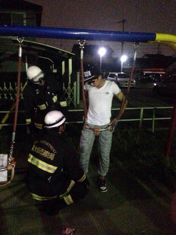 【画像】 大阪のDQN、幼児用ブランコに座って抜けられなくなり消防隊が救出 苦悶の表情浮かべる